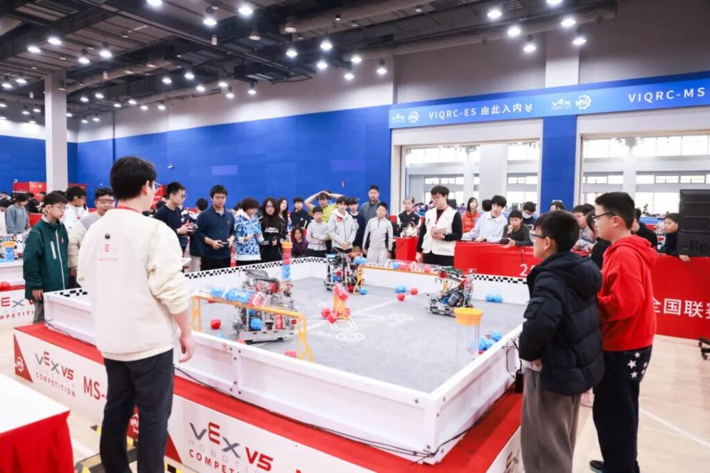 赛场之上,两大竞赛主题同步上演精彩对决:小学与初中组的选手们 VIQRC “和而不同”主题下,展现了出色的团队协作与策略应变能力。初中与高中组的对抗在 V5RC “狭路相逢”中激烈展开,力量、技巧与智慧的火花四溅,将现场气氛不断推向高潮。